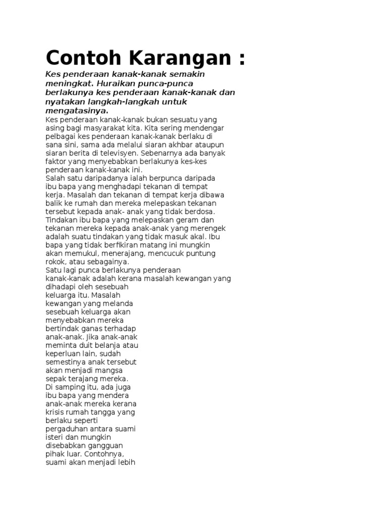 - Bila pergi melawat. Contoh karangan isu penderaan kanak-kanak. Contoh Karangan Faktor Kes Penderaan kanak Kanak Kekurangan Ilmu dalam menjaga anak Ibu bapa pernah menjadi mangsa penderaan Pegangan agama yang rapuh Tekanan dan gangguan emosi Kedudukan ekonomi keluarga yang tidak kukuh Penutup Karangan Penderaan kanak-kanak.